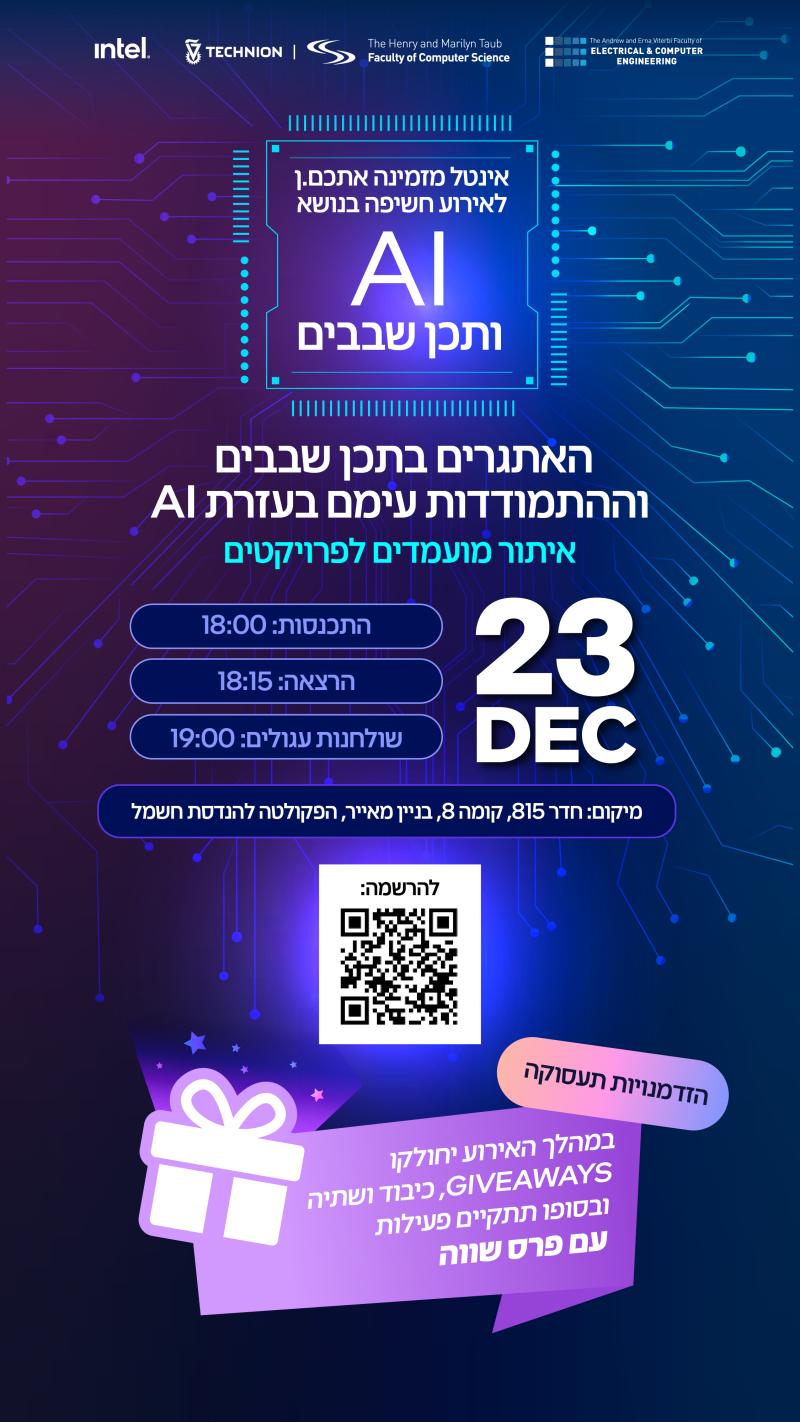 האירוע יכלול הרצאה ושולחנות עגולים עם מהנדסי אינטל, לדיון ברעיונות לפרויקטים עתידיים מבוססי AI וכמובן מרצ' והפתעות נוספות!